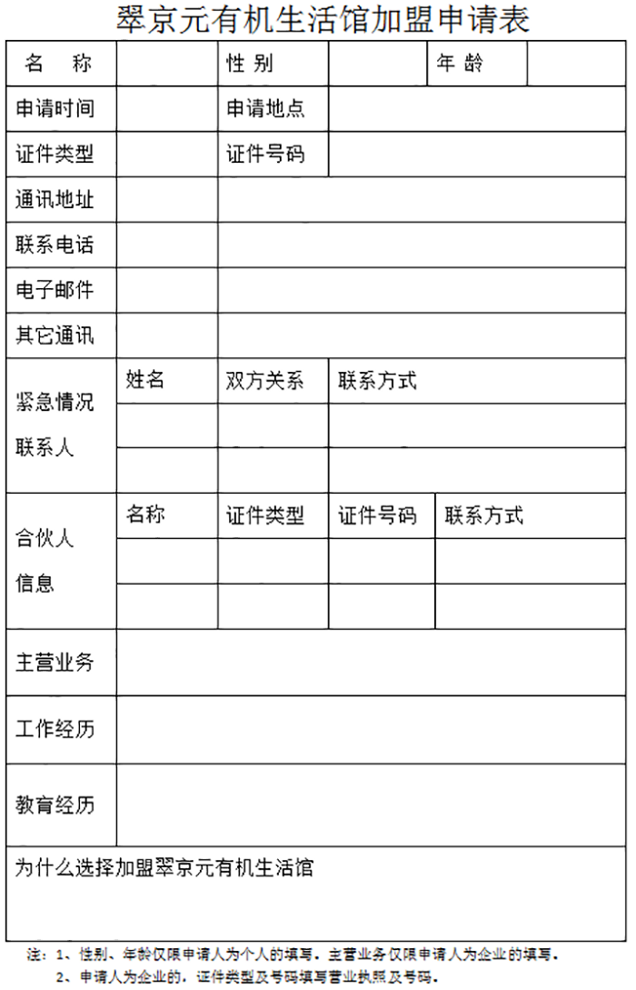 1、申请人需对“翠京元”品牌有高度的认同,对于“有机产品”和“有机生活理念”有高度的认同。2、申请人需为完全民事行为能力人或独立法人,并向公司总部提交真实的基本信息。 3、申请人需拥有诚信、正直的品格,能够认真负责加盟店的运营工作。 4、申请人需具有独立、稳定的经济能力和基本的财务管理能力。具有一定的组织管理经验,能管理、激励员工行为。 5、如果申请人为合伙经营模式的,申请人在加盟店投入资本中所占比例不低于51%。需向公司出具有效投资占比证明。 6、申请人在达成加盟协议后,需付清“品牌信用保证金”方可获得翠京元有机生活馆加盟授权书。 ![]() |