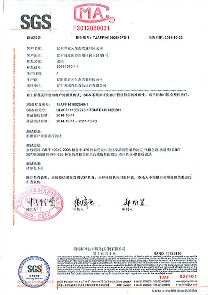 辽阳翠京元有机水稻种植基地小北河地块去年亩产905斤,今年亩产1239斤;黄泥洼地块去年亩产1102斤,今年亩产1257斤,两地块相比去年平均增产26%。稻谷按照国家有机标准检测了98项农残药残,结果均是未检出。