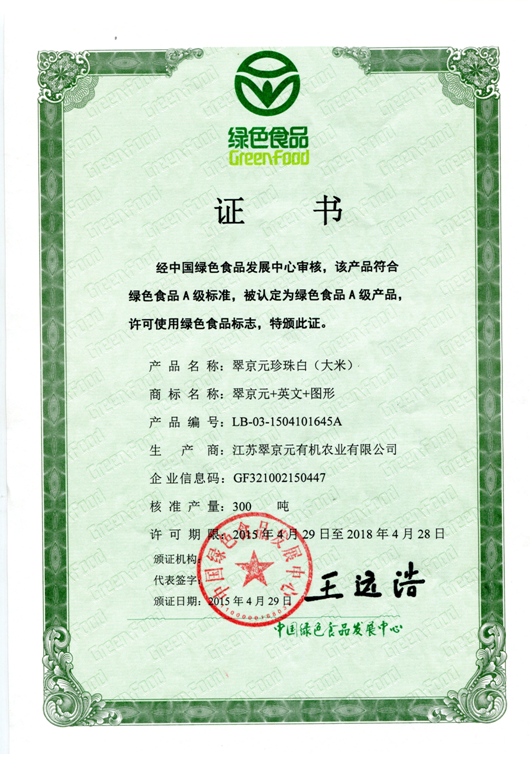 江苏翠京元水稻种植基地喜获国家绿色大米认证!