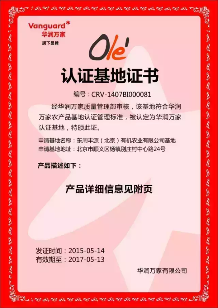 热烈祝贺翠京元──东周丰源北京基地荣获华润万家基地认证!2015年5月,东周丰源北京有机基地通过了华润万家质量管理部审核,被认定为华润万家认证基地。这样基地就有了有机认证和华润认证“双认证”。 ![]() 翠京元有机产品,源自诚信的过程!——这是翠京元有机基地创始人张朝晖先生带领着翠京元人从始至终秉承的理念和践行的企业价值观。翠京元,从改良土壤开始,致力于打造国内顶级有机食品生产企业! ![]() ![]() ![]() ![]() ![]() ![]() ![]() ![]() ![]() ![]()
