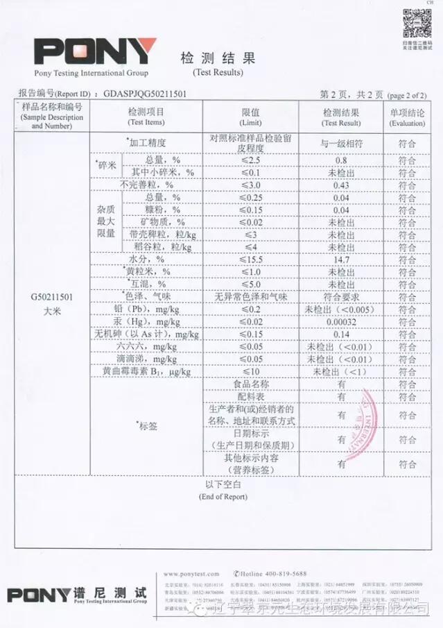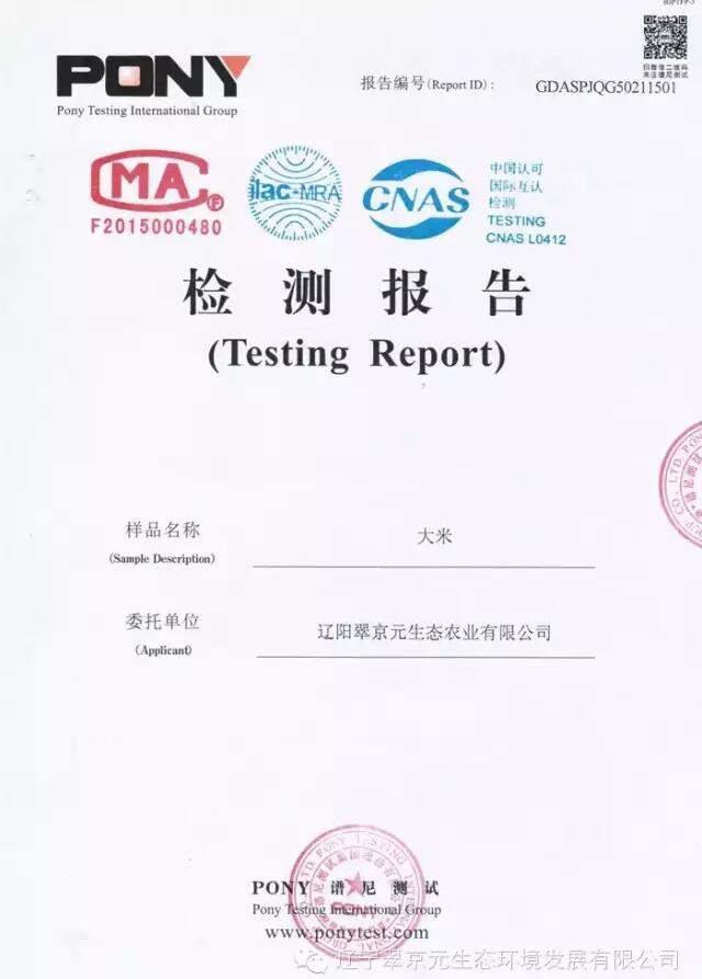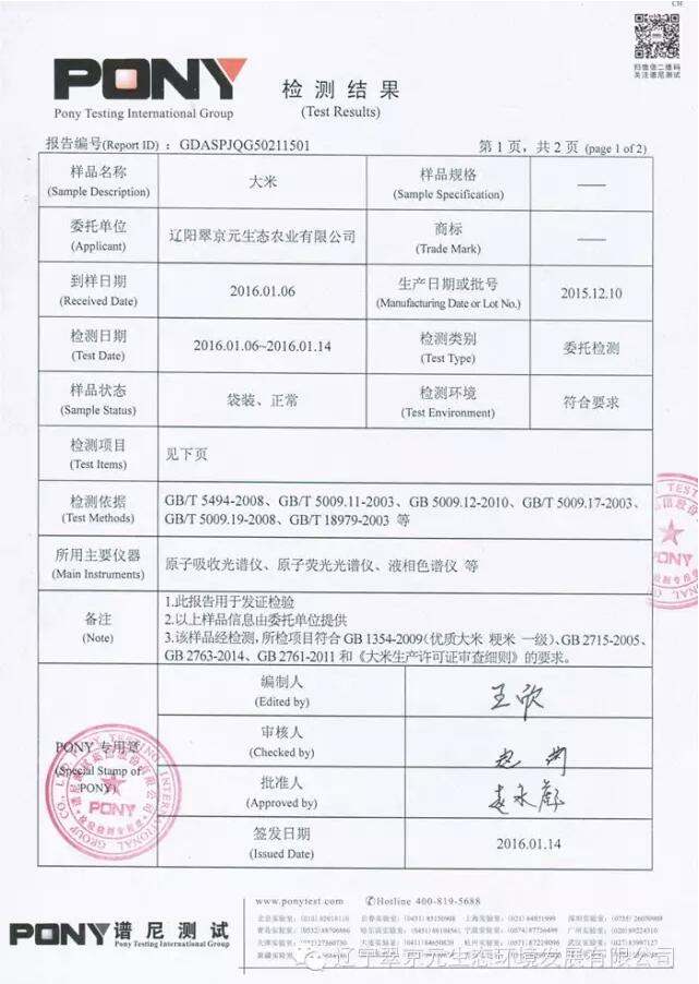 热烈祝贺翠京元有机鸭稻米通过优质粳米一级标准检测!