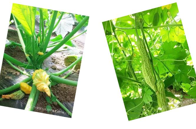 翠京元有机农场:坐果的飞碟西葫芦和即将成熟的苦瓜