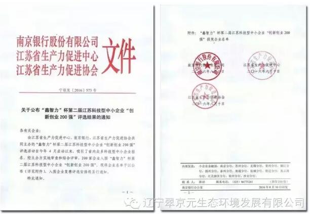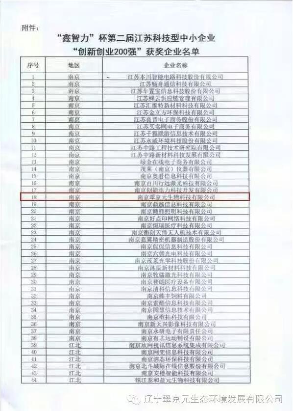 由江苏省生产力促进中心、南京银行、江苏省生产力促进协会共同主办的“鑫智力”杯于8月10日公布“创新创业200强”名单,南京翠京元生物科技有限公司榜上有名!