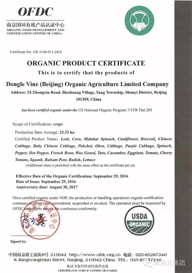 2016年9月,东周丰源(北京)有机农业有限公司通过南京国环有机食品认证中心(OFDC)获得美国USDA/NOP(美国农业部 United States Department Of Agriculture)有机认证。自此,东周丰源(北京)有机农业有限公司出产“翠京元有机蔬菜” 可直接出口到美国,以及其他认可NOP标准的国家和地区。这是“翠京元”品牌与产品国际化的起始,也为翠京元集团第四版块业务打下了基础。 USDA认证以 NOP(National Organic Program)法规为标准,该法规由美国农业部制定,主要包括: 1、使用成分不含任何化学合成物质,如化肥,杀虫剂,抗生素,食品添加剂以及转基因动植物。 2、使用成分所生长的土壤,至少三年以上没有使用过化学合成物质。 3、定期检查生产和销售记录。 4、保持有机认证产品的严格物理隔离。 5、检验有机产品的生产设施厂房。 6、全部是由有机成分的产品可以使用标签注明“100%有机”或使用USDA徽标。