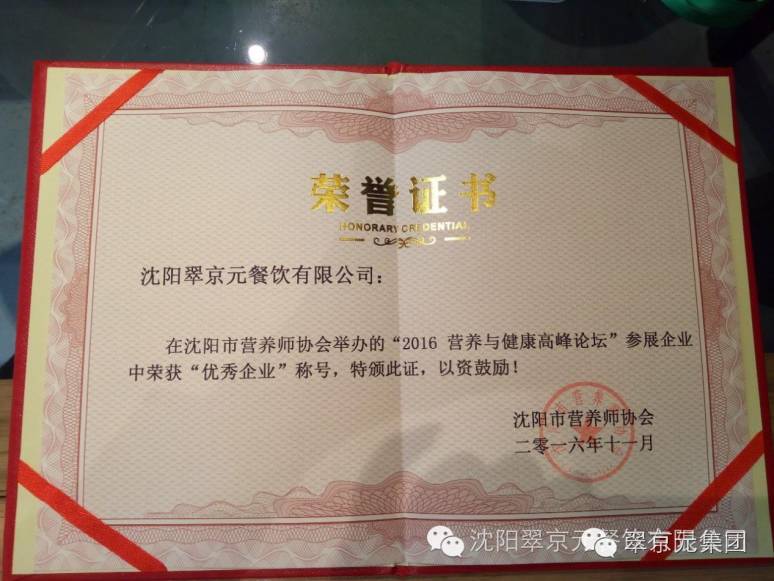 2016年11月6日,由首都保健营养美食学会和赛福凯瑞医学研究院主办,沈阳市营养师协会、中国医科大学附属第一医院临床营养科承办的“2016中国营养与健康高峰论坛——辽宁分论坛”在辽宁省沈阳市成功举办。沈阳翠京元餐饮有限公司受邀参加了本次论坛。