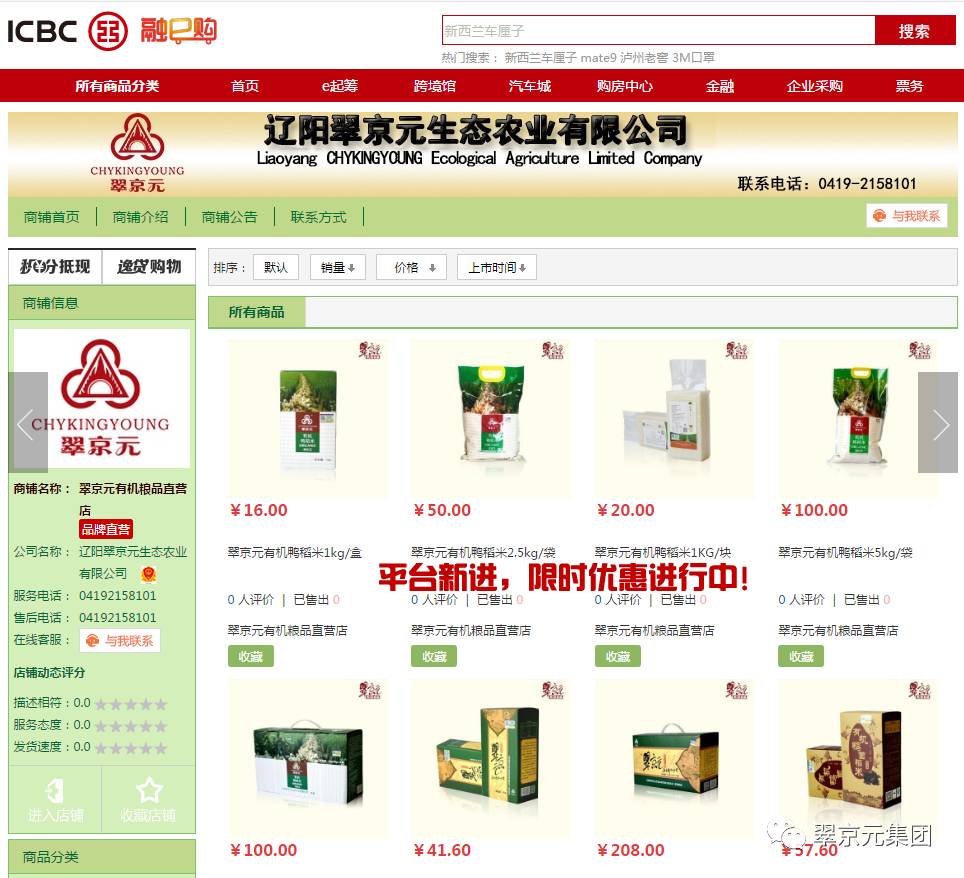 2016年12月30日,翠京元有机大米、有机杂粮正式入驻中国工商银行“融e购”电子商务平台(以下简称“工行电商平台”)。