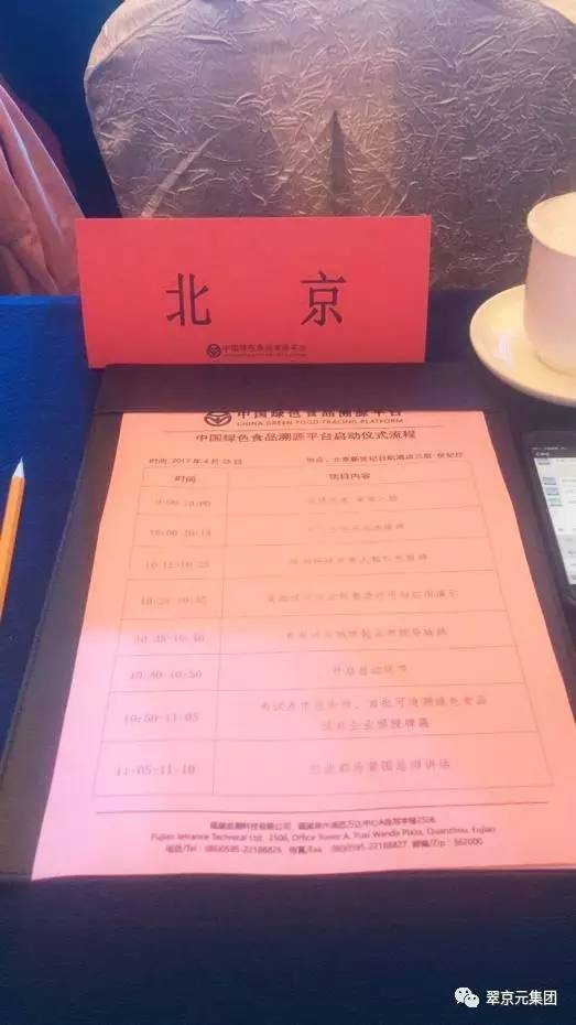 2017年4月25日,由国家农业部中国绿色食品发展中心与福建追溯科技有限公司联合举办的中国绿色食品溯源平台启动仪式在北京新世纪日航酒店举行。农业部总畜牧师马爱国、农业部农产品质量安全监管局副局长金发忠、中国绿色食品发展中心主任王运浩、包头市人大常委会副主任王章、绿色食品工作机构负责同志、中国绿色食品发展中心、中国绿色食品协会有关同志、绿色食品生产加工企业的代表,以及部分协会理事会单位代表、会员等出席了启动仪式。启动仪式由中国绿色食品发展中心副主任陈兆云进行主持。东周丰源(北京)有机农业有限公司(以下简称“东周丰源”)应邀出席本次活动。