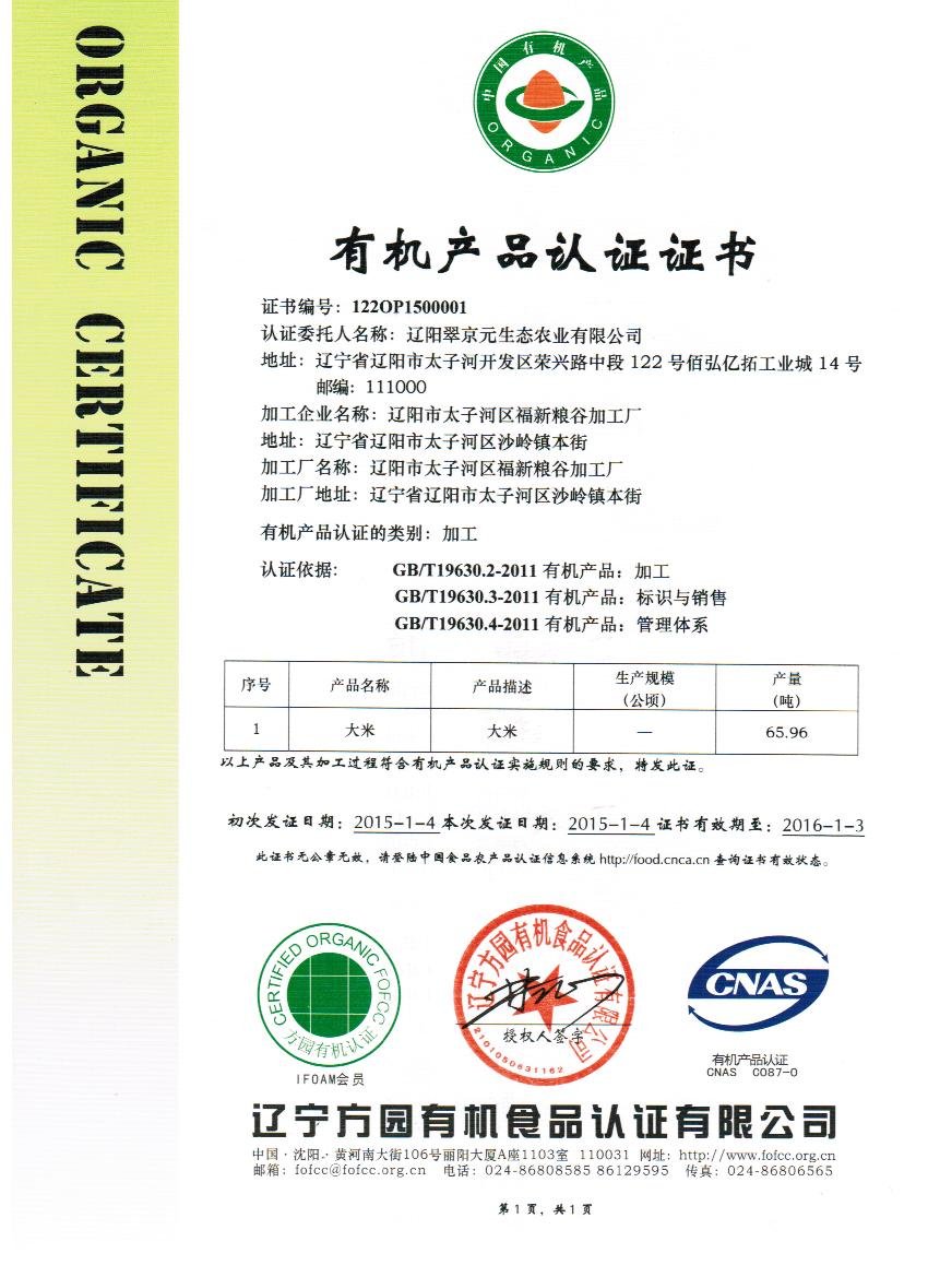 翠京元有机鸭稻米富含蛋白质、氨基酸、维生素,以及锌、硒、锰、铜、铁等微量元素,是一种高级营养食品。鸭稻米米粒饱满,色泽晶莹。煮成饭后,其饭味香浓,软硬适中,香滑爽口,具有回归自然的感觉,可谓米中之极品。 ![]() 有机证书 ![]() 产品效果图 |