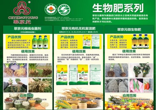 展会中,我司将重点展示翠京元品牌形象,展销翠京元研发新成果--接种菌剂(粉状)、有机-无机复混肥,翠京元土壤改良剂系列产品—微生物肥、根线虫菌剂;以及翠京元有机农产品系列—大米、杂粮、蔬果等。