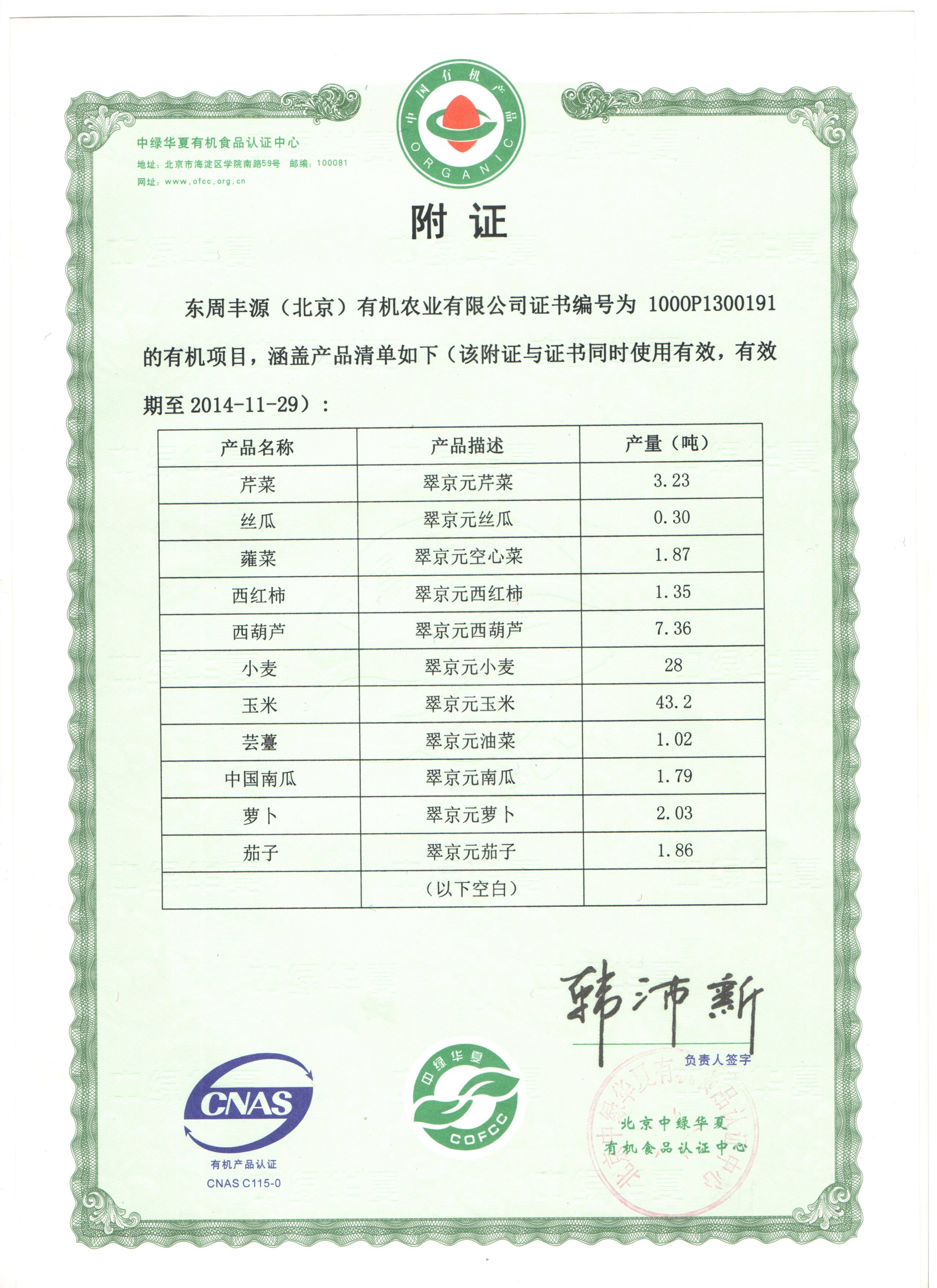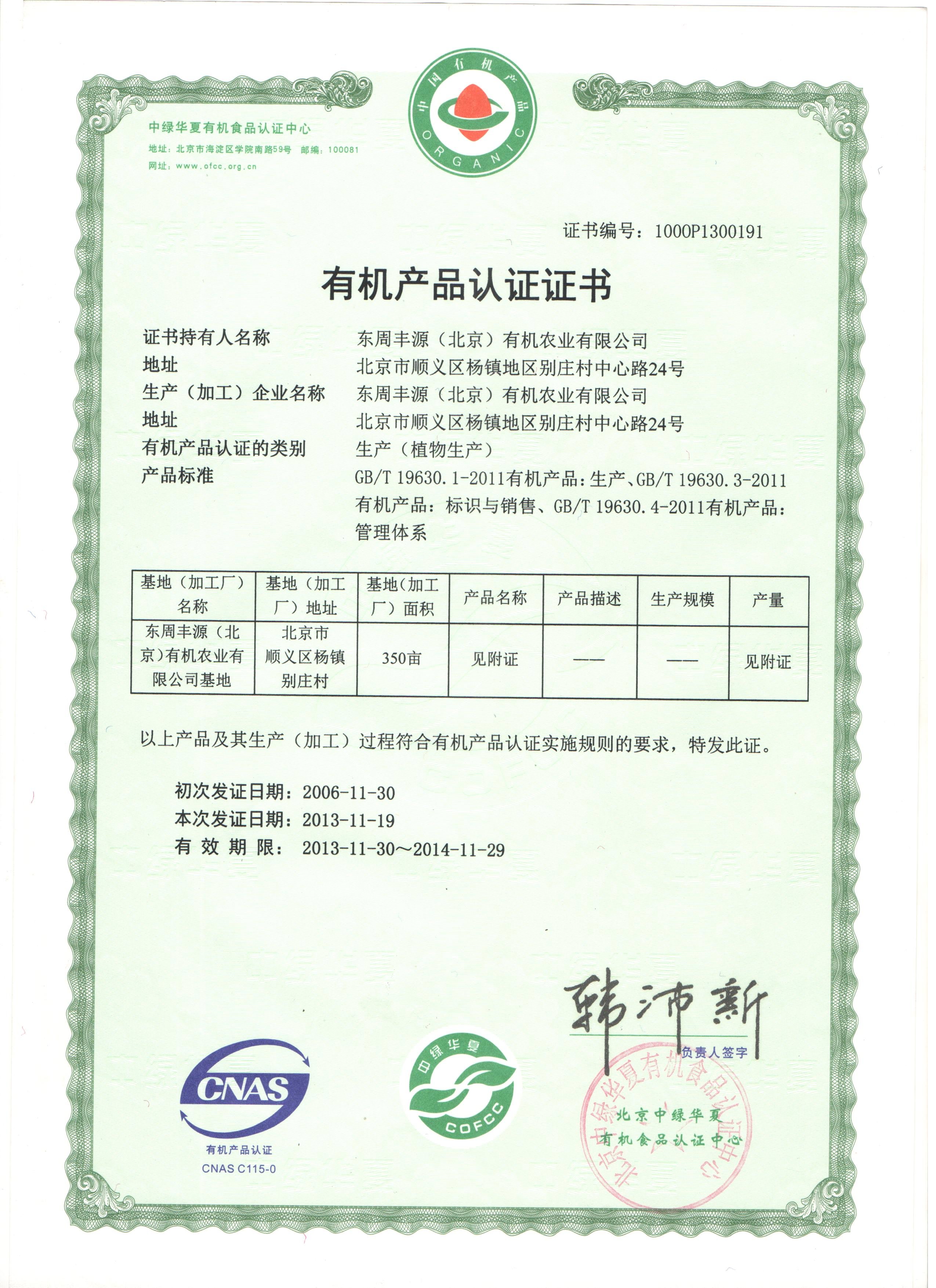 公司获得北京中绿华夏有机食品认证中心颁发的